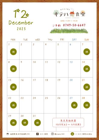 キテハ食堂 【令和7年12月】営業カレンダー