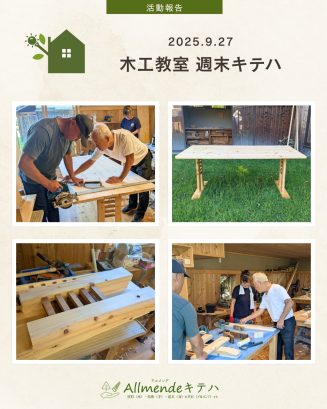 EVENT 【イベント】9/27 週末キテハ”テーブル・ベンチをつくろう”開催! 週末、アルメンデキテハ棟に集まって一緒に木と触れ合いませんか? 木工教室「週末キテハ」は、環境に優しいものづくりを手掛けるプロの職人から、木工技術を学び、ものづくりをする教室です。使用するのは地元の製材所で生まれた国産木材(... EVENTNEWS週末キテハ