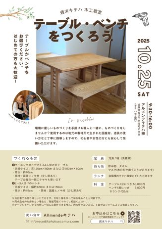 EVENT 【イベント】10/25 週末キテハ”テーブル・ベンチをつくろう”開催! 週末、アルメンデキテハ棟に集まって一緒に木と触れ合いませんか? 木工教室「週末キテハ」は、環境に優しいものづくりを手掛けるプロの職人から、木工技術を学び、ものづくりをする教室です。使用するのは地元の製材所で生まれた国産木材(... EVENTNEWS週末キテハ